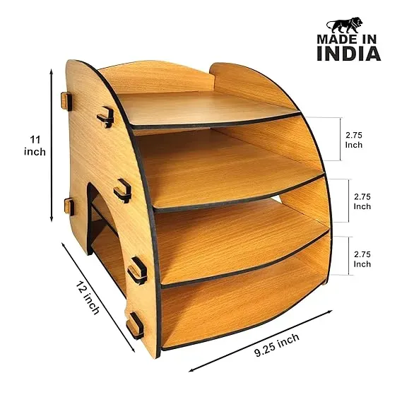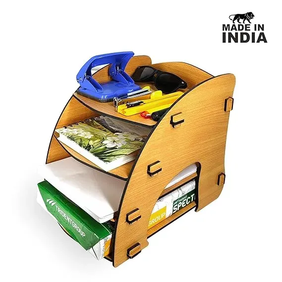 In today’s hybrid work culture, whether you're managing your tasks from a corporate office, home workstation, or study table, having a clean and organized space can make a huge difference. The Woodkey 4-Tier Desk Organizer is designed with that exact goal in mind — to declutter your workspace while adding a touch of natural elegance. Crafted from premium engineered wood in a warm Bavarian Beech Finish, this 4-tier tray not only helps keep your documents, books, and accessories in place but also enhances the aesthetics of your desk. With additional features, this product becomes a complete desk solution for professionals, students, teachers, or anyone working in a paper-intensive environment. This desk organizer tray features four horizontal layers that can neatly hold A4-size documents, folders, answer sheets, notebooks, bills, envelopes, letters, and more. It allows for efficient categorization — so you can keep important paperwork separate and easy to find. Use it as an office file tray, a study table paper rack, or even as a mail sorter. The top surface doubles up as a mini shelf — perfect for keeping calculators, notepads, staplers, or tape dispensers. The wood grain-inspired finish in Intal Beech color gives a modern yet rustic appeal. It fits easily into any professional or personal setting and complements both light and dark furniture. Made from durable engineered wood, this plastic-free desk organizer is not just strong but also sustainable — great for eco-conscious buyers. Maximizes Desk Space – No more scattered papers or stacked books. Boosts Work Efficiency – Quick access to categorized files and notes. Promotes Clean Habits – Encourages tidy habits in office and study spaces. Ideal for All Ages – Whether you're a professional, student, or teacher. Perfect for Corporate Gifting – Sleek design and utility make it a great office gift. Low Maintenance – Just wipe with a dry cloth to keep it looking fresh and clean. Quick Assembly – Plug-and-slot construction means no screws or tools required. Working professionals who deal with paperwork, reports, or billing. Teachers and examiners needing organized answer sheet storage. Students managing books, assignments, and notebooks. Home business owners sorting bills, packaging slips, invoices, and receipts. Receptionists or office administrators keeping incoming/outgoing letters sorted. On your office desk for keeping contracts, reports, and confidential files. On a study table to organize textbooks, journals, and stationery. In a clinic or reception desk for sorting patient records or brochures. At a home office for managing invoices, tax papers, and utility bills. The organizer is designed to be durable, stable, and stylish. Precision laser-cut panels ensure that each slot fits seamlessly, giving it a high-end handcrafted feel. Unlike plastic trays that warp or metal trays that rust, this wooden option retains its shape and shine for years. The edges are smooth and rounded for safety, and the open-front design of each tray lets you pull out or insert documents quickly. Every Woodkey product is 100% made in India, supporting local artisans and eco-conscious production methods. Your purchase directly contributes to sustainable jobs and responsible business. Yes, all shelves are built to support A4 paper, folders, and files. Absolutely. Made from high-grade engineered wood, it is built to last. Minimal assembly is required. No tools needed — simple slot-in method. Yes, its sleek design and utility make it perfect for birthdays, promotions, or corporate gifting. Visit: www.gurez.com DM us on Instagram: @woodkey_gurez Bulk & custom branding available for corporate buyers — get in touch!Product Overview: Woodkey 4-Tier Desk Organizer
