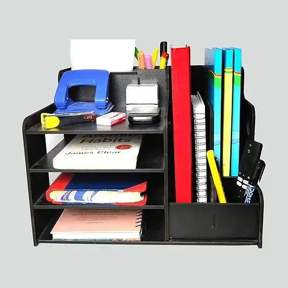 Woodkey 4-Tier File Organizer – Multifunctional Office File & Pen Holder with Paper Tray and Side Compartments | Black Finish | Desktop Organizer for