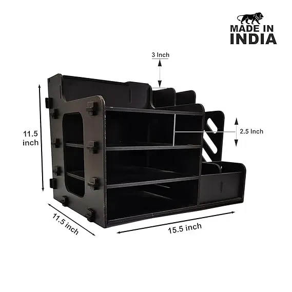Clear your desk, clear your mind. The Woodkey 4-Tier File Tray Organizer in Black Finish brings functionality and style to modern workspaces. Designed for people who appreciate clean lines and high utility, this desk accessory fits seamlessly into offices, home study areas, and reception desks. Crafted from engineered wood and styled in deep matte black, it features 4 horizontal trays that neatly store files, notebooks, and bills. A flat top shelf offers space for your stapler, tape, or charger. With its precision laser-cut parts, setup is quick and tool-free. Sleek Black Aesthetic for Any Workspace Office Desk – Store daily reports & client folders Yes. It’s built strong enough to hold thick books or registers. No. This variant focuses purely on tray organization. Under 5 minutes. Slot design eliminates tool usage. The matte finish resists regular stains and is easy to wipe. Yes. The matte black finish is universal and timeless. ALT Tags for Website:Product Info Table: Woodkey 4-Tier File Organizer